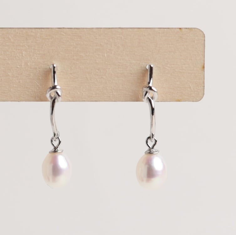 Elegant drop earrings featuring white freshwater pearls suspended from silver knot accents. A graceful design symbolizing timeless beauty and subtle sophistication.