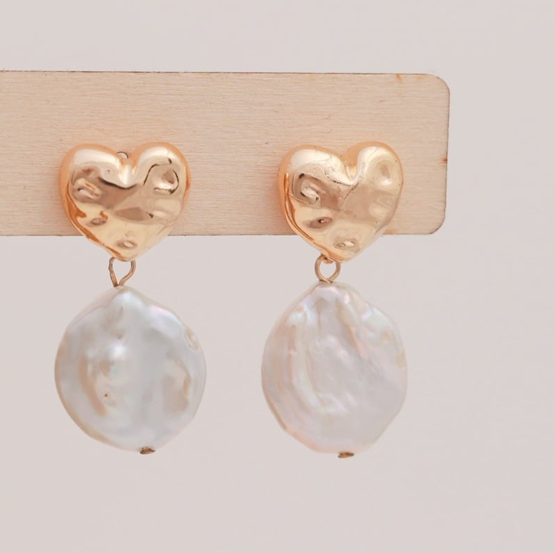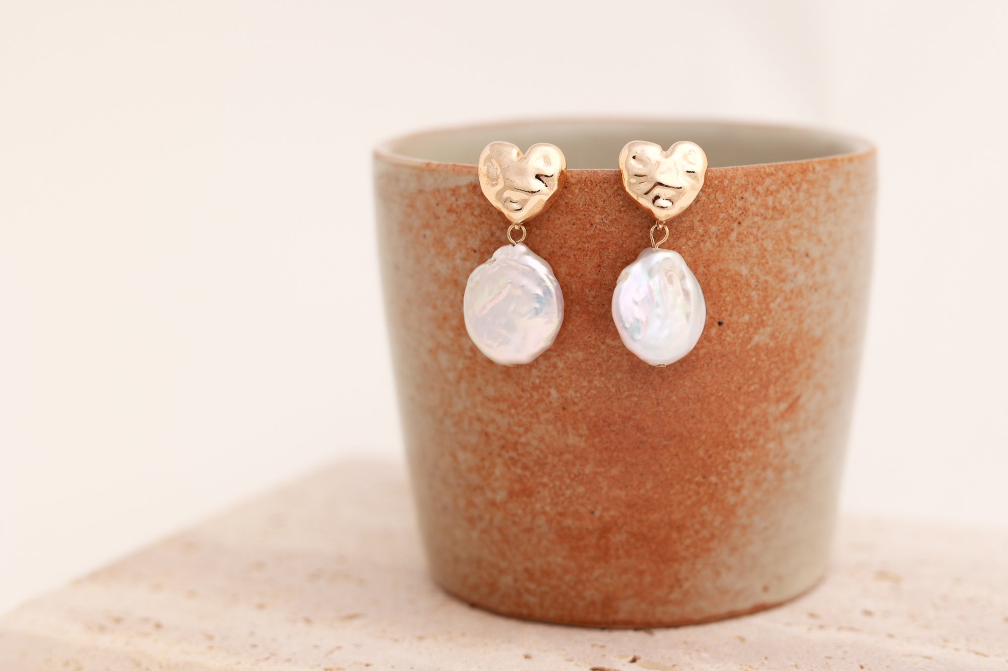 These earrings feature large baroque pearls hanging from gold heart studs. Romantic and bold, they combine playful charm with elegant pearl beauty.