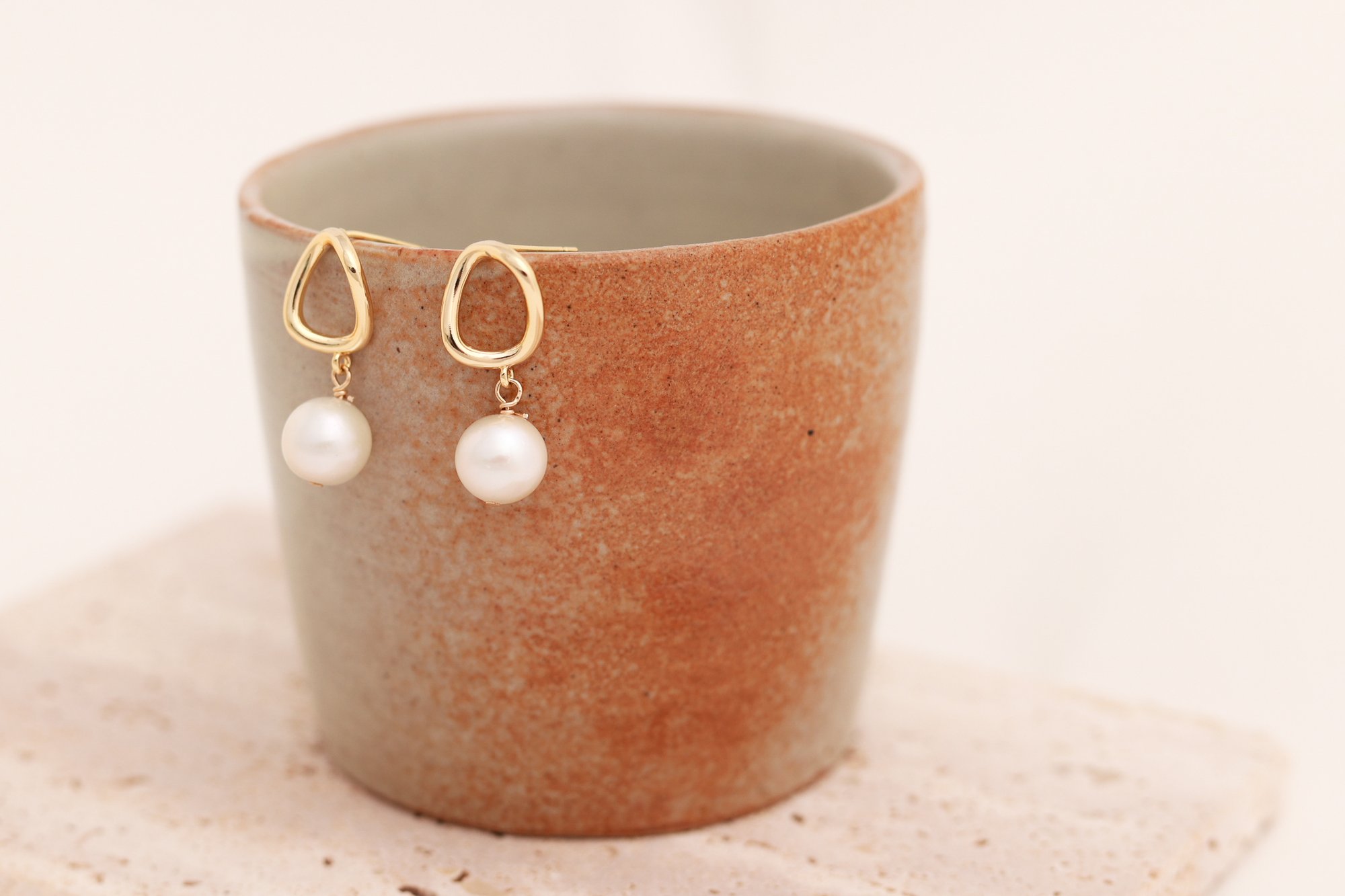 These earrings feature round pearls hanging from open gold oval studs. A simple and elegant design that blends modern style with classic pearl beauty.