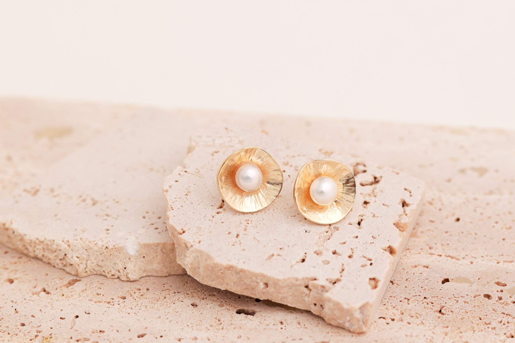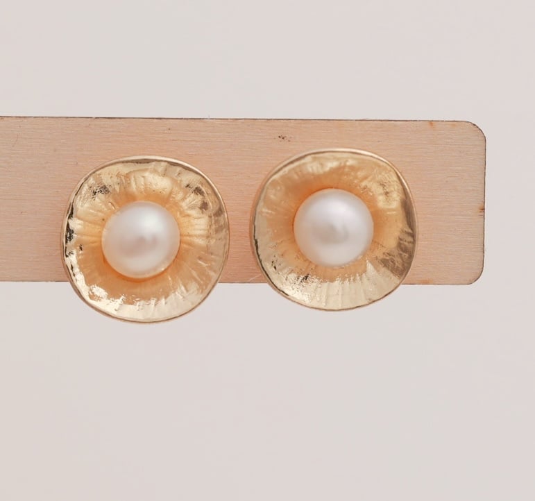 These earrings feature round pearls set in textured gold disc studs. With a soft yet bold look, they blend modern design with timeless pearl elegance.
