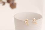 These earrings have two small pearls on each side, held by delicate flower-shaped gold loops. A sweet and graceful design with a soft, graceful feel.