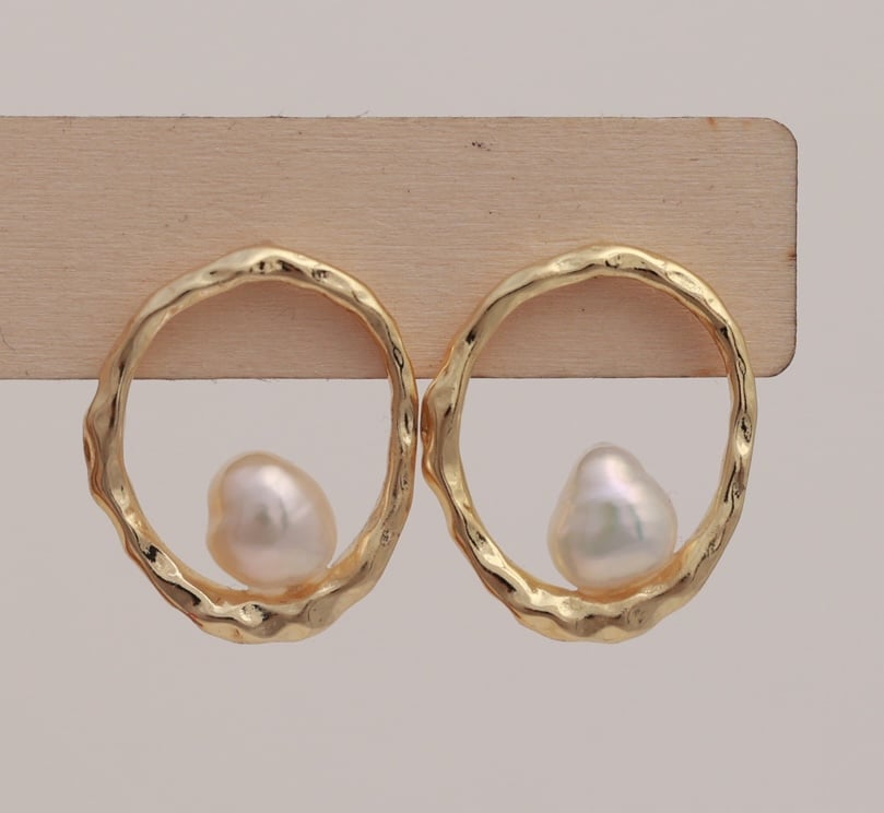 These earrings have a wavy gold circle with a pearl set at the bottom inside. A modern yet natural style, mixing soft pearl glow with textured gold.