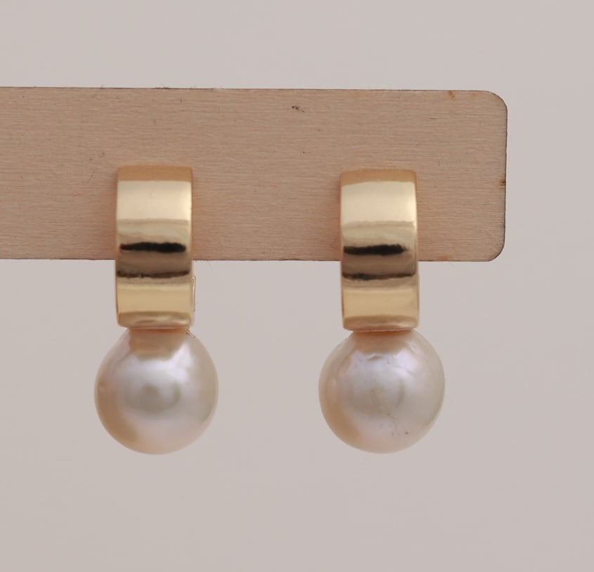 These earrings feature a bold, smooth gold hoop with a round pearl hanging. The design is clean and elegant, giving a strong yet classic look.