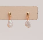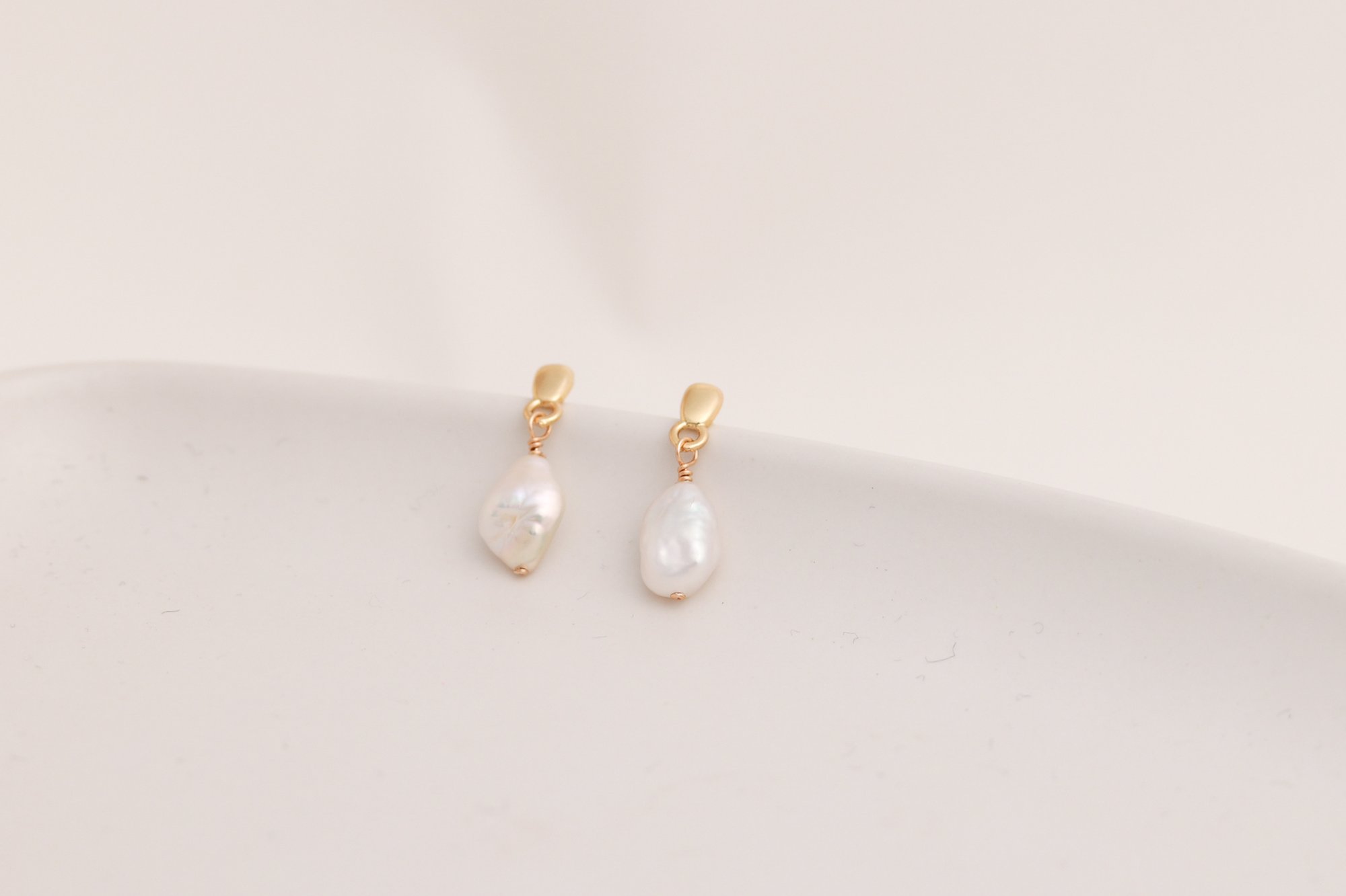 These earrings have smooth gold studs with natural baroque pearls hanging below. The design is minimal yet elegant, letting the unique pearl shapes stand out beautifully.