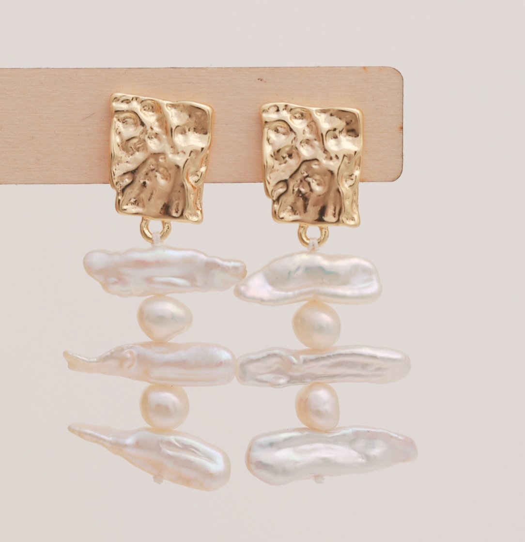 These earrings feature textured gold studs with stacked pearls in unique stick and round shapes. The layered design gives them a bold, artistic style while keeping a natural and elegant look.