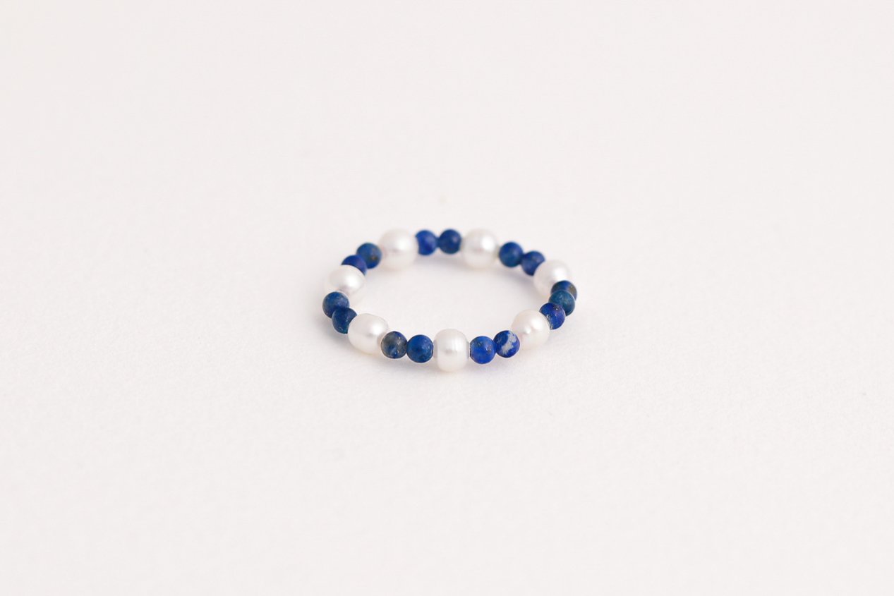 This stretch ring features freshwater pearls paired with lapis lazuli beads for a minimalist, refined look. Its flexible design ensures a comfortable fit, making it a versatile piece for both everyday wear and special occasions.