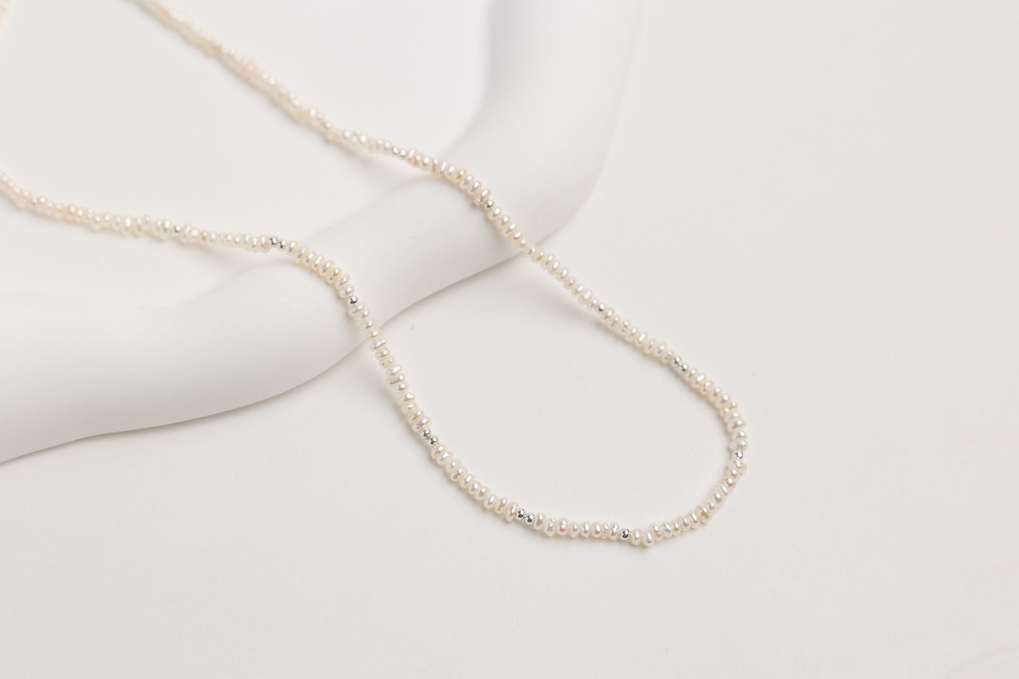 Discover a one-of-a-kind necklace harmonizing delicate sterling silver beads with the elegance of freshwater pearls. This masterpiece is a labor of time and craftsmanship, meticulously threading each tiny silver bead alongside the lustrous pearls.