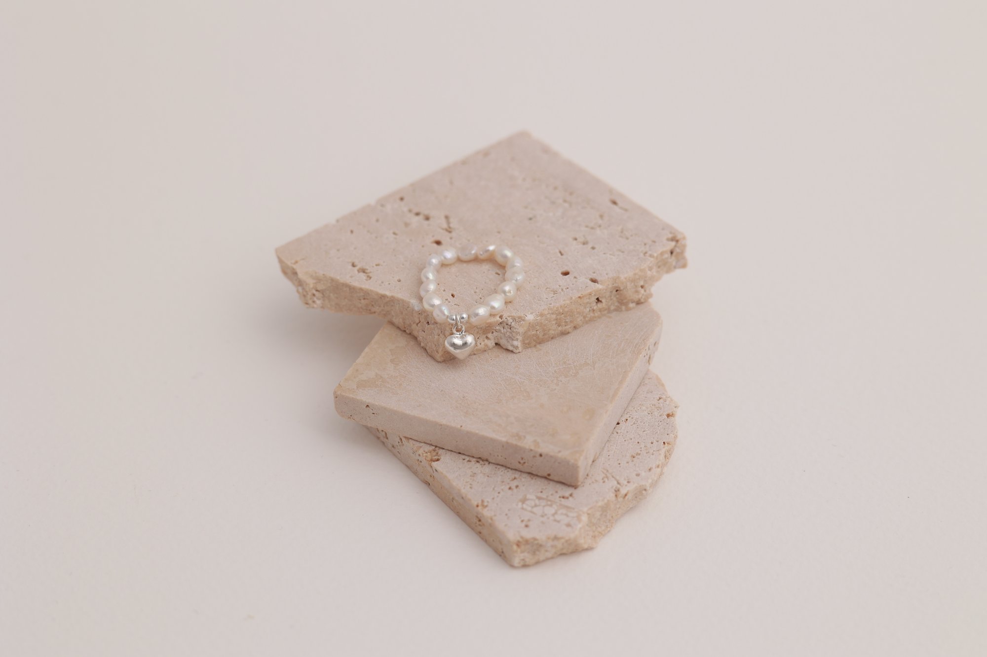 A delicate stretch ring crafted from natural freshwater pearls, finished with a petite sterling silver heart charm.